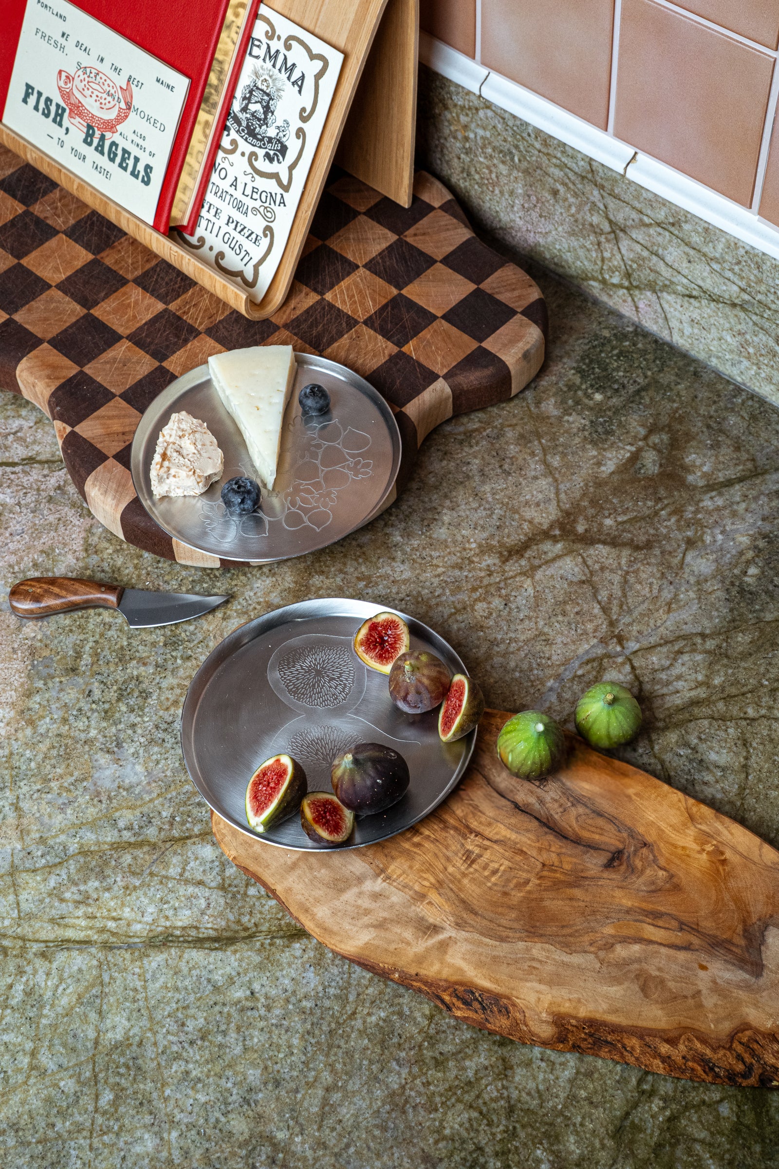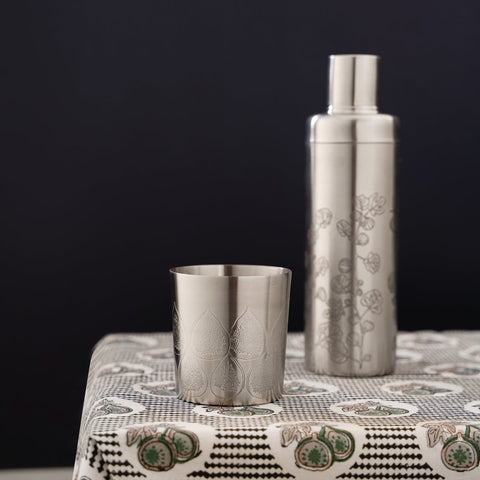 Metalware includes table and bar ware crafted in stainless steel using traditional etching techniques that create durable, detailed, functional pieces.
