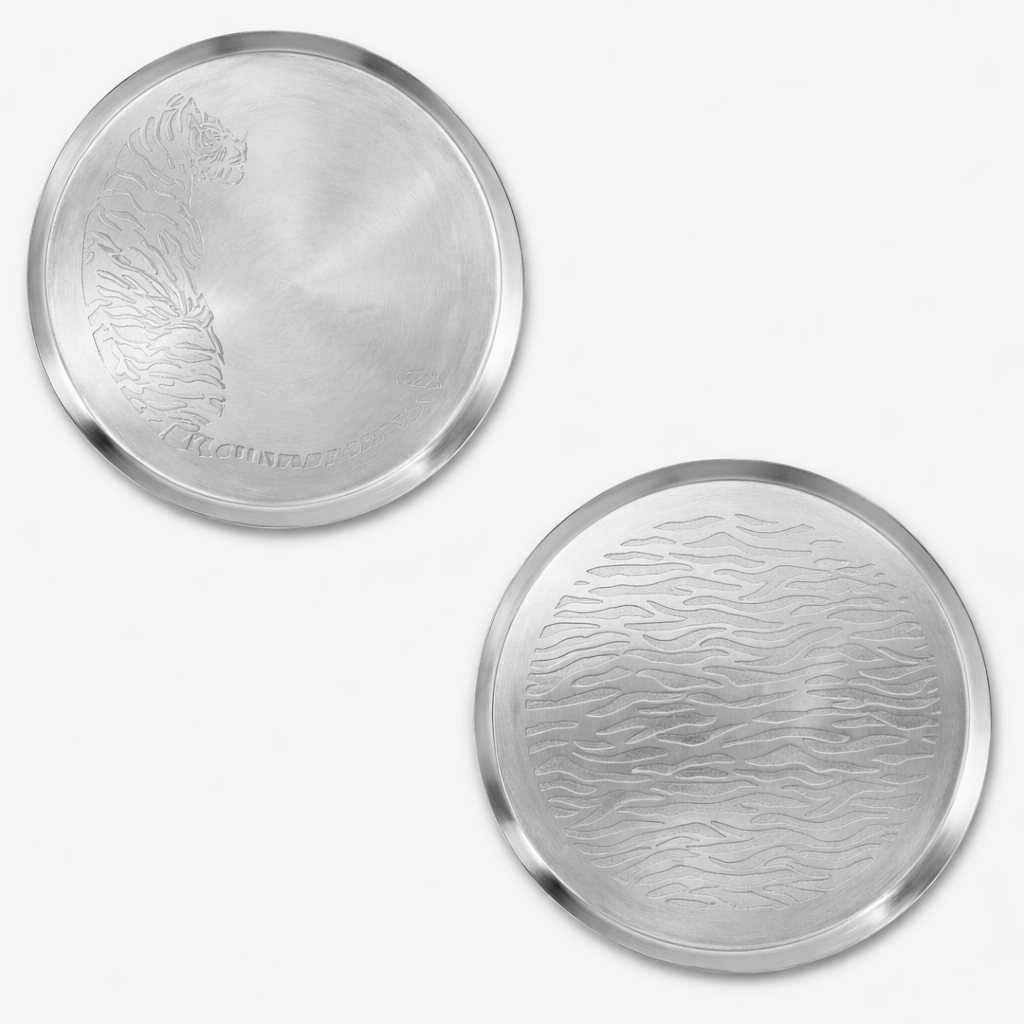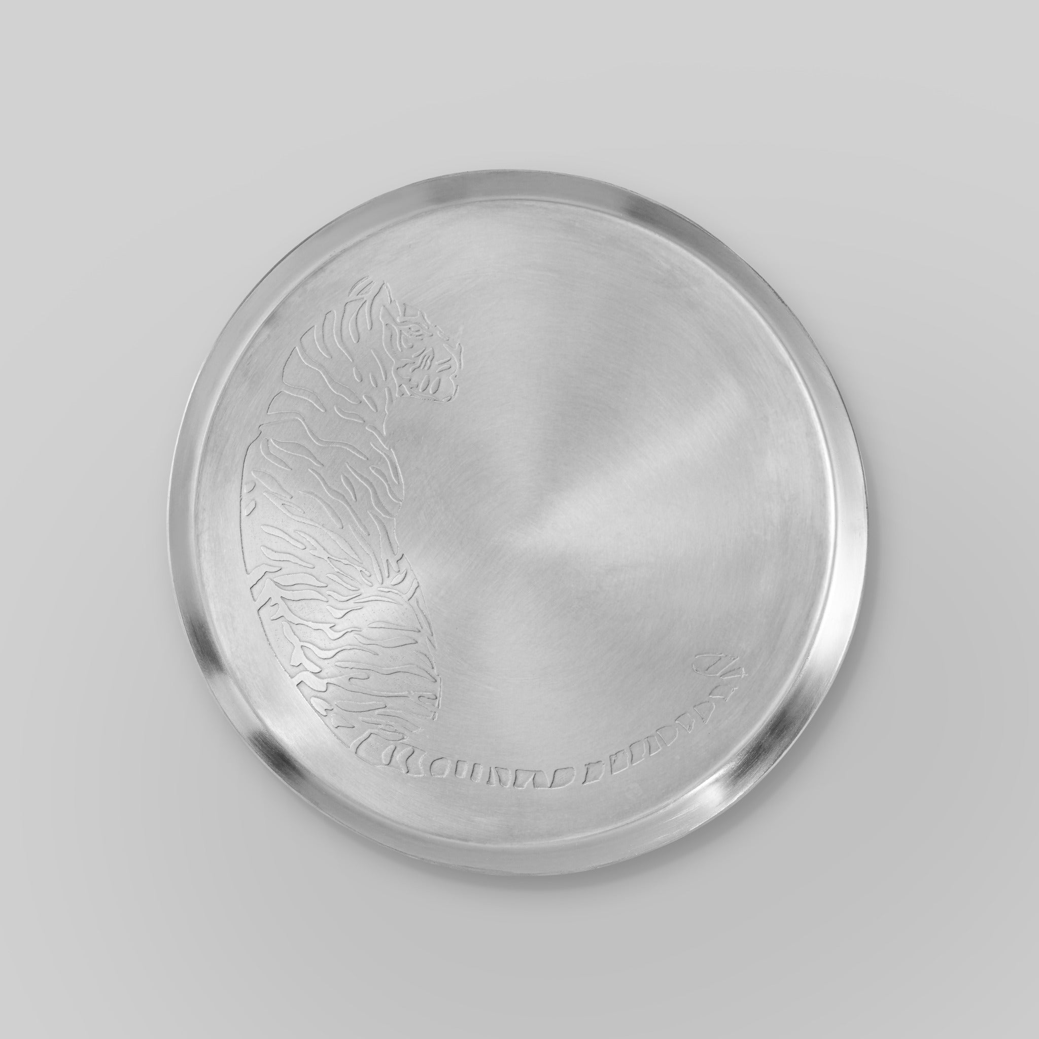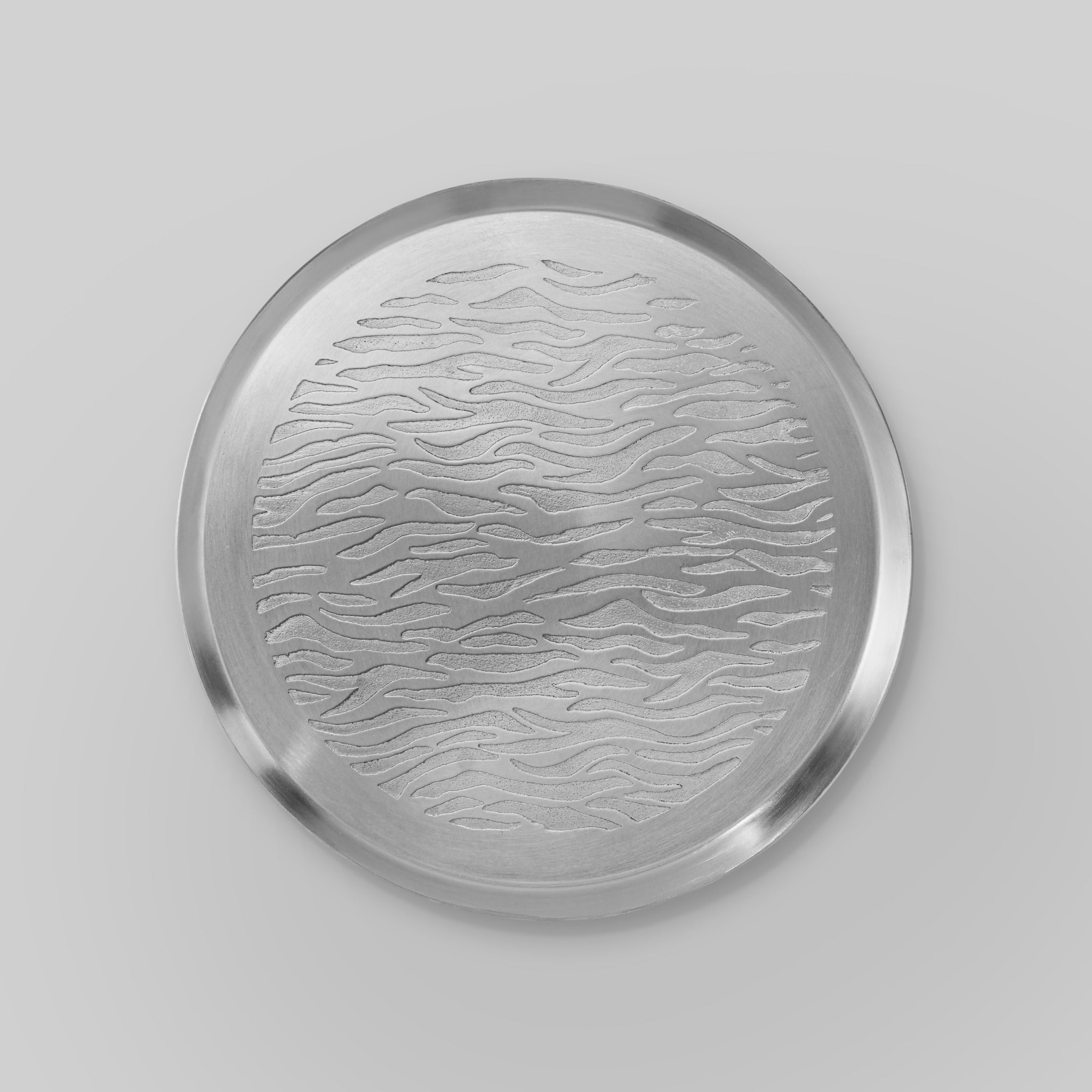 Hand crafted matt silver stainless steel etched plate featuring a tiger inspired pattern. Each plate is individually worked, creating subtle variations in texture and detail that make every piece unique. Designed as both functional tableware and an artisanal object, it brings character, craftsmanship, and visual interest to the table.
