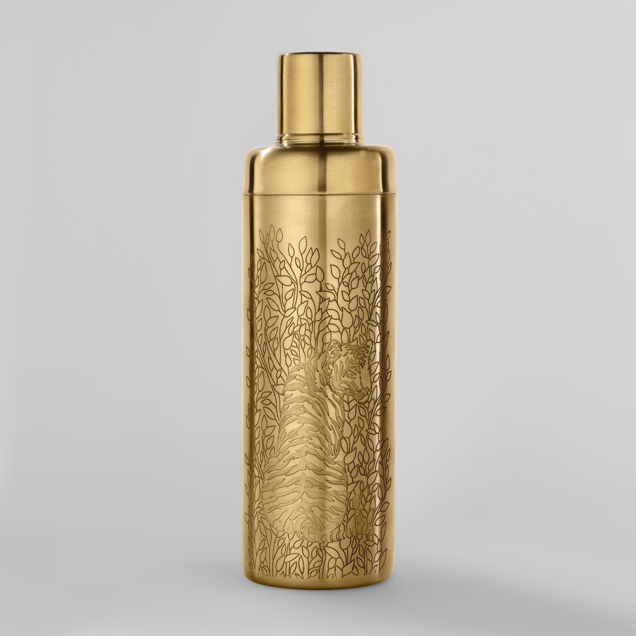 This hand crafted gold finished cocktail shaker features an intricately etched tiger emerging through dense foliage. The detailed engraving is carefully worked into the metal, creating depth, texture, and a striking visual narrative inspired by the quiet strength of the tiger.