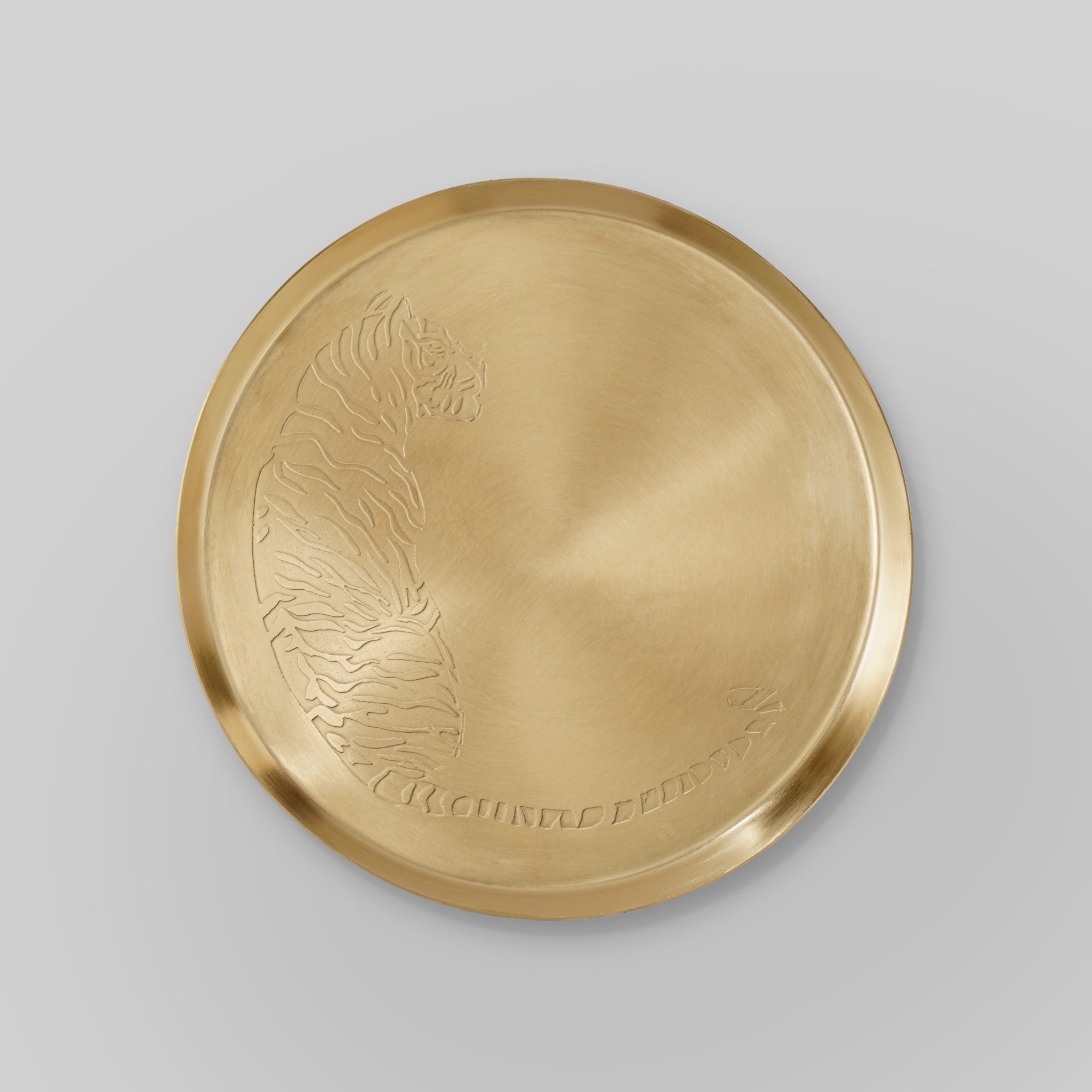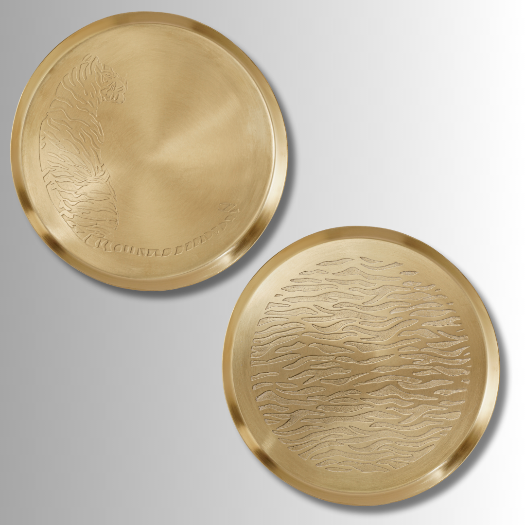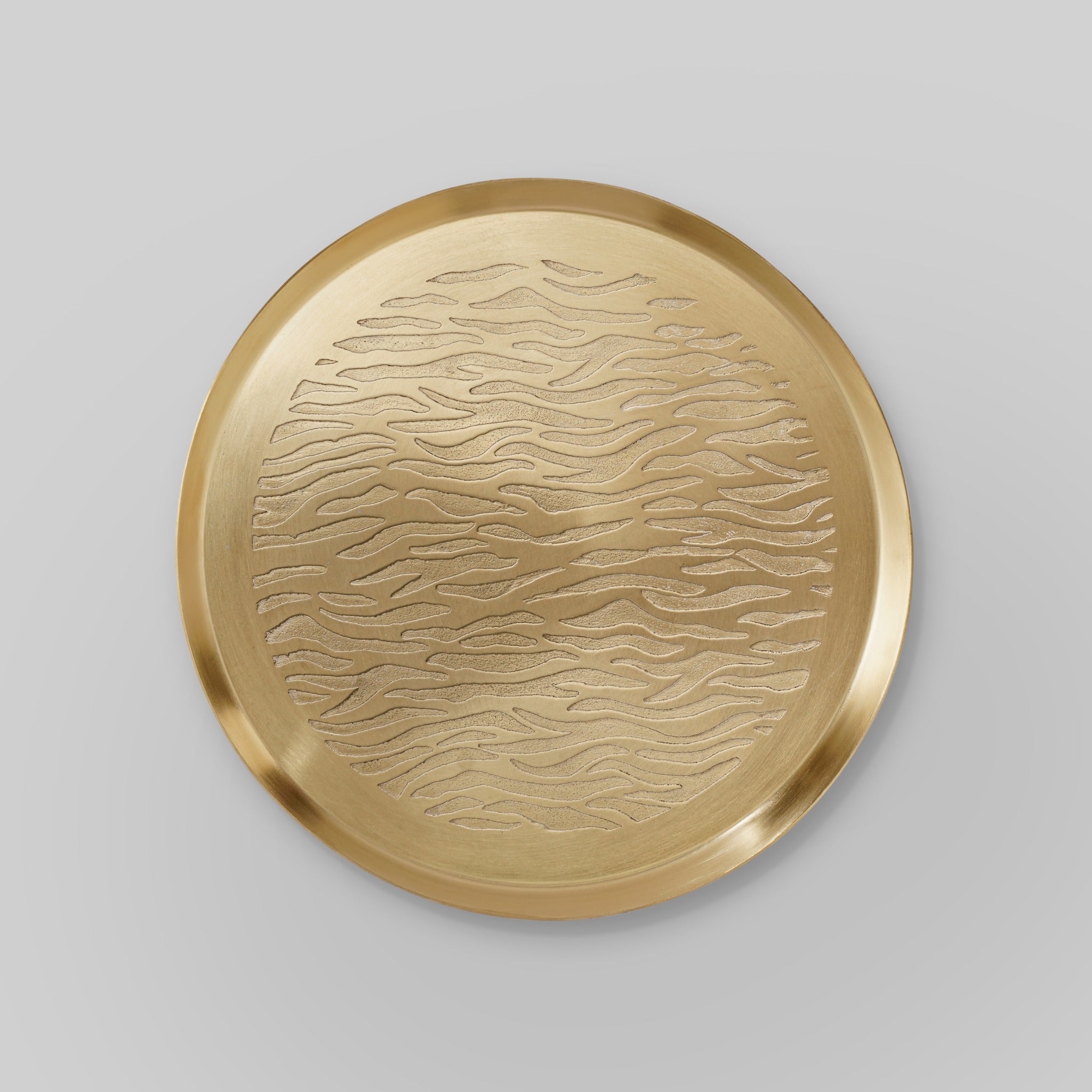 Hand crafted gold stainless steel etched plate featuring a fig inspired pattern. Each plate is individually worked, creating subtle variations in texture and detail that make every piece unique. Designed as both functional tableware and an artisanal object, it brings character, craftsmanship, and visual interest to the table.